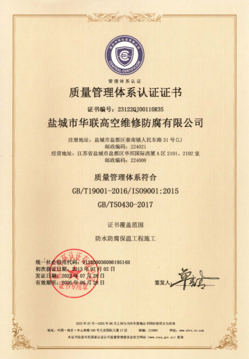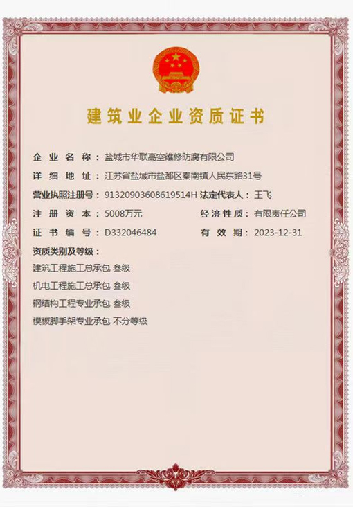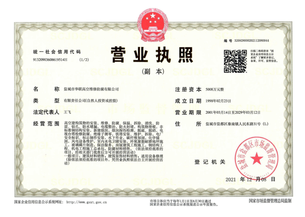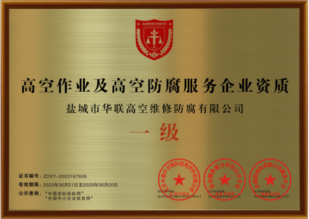 鹽城市華聯(lián)高空維修防腐有限公司始建于上世紀(jì)八十年代,系專業(yè)從事風(fēng)力發(fā)電機(jī)塔筒防腐,塔筒維護(hù),塔筒補漆,塔筒噴字等工程。不停產(chǎn),不搭手架,高空懸吊施工的一級高空安全資質(zhì)、一級高空防腐施工資質(zhì)、二級建筑施工資質(zhì)的高空建修、防腐工程、公司?,F(xiàn)已發(fā)展集科研、設(shè)計、施工為一體的的江蘇省較大的高空建修,高空防腐施工企業(yè);公司注冊資金3008萬元,流動資金8000多萬元;擁有高修技術(shù)科研高修工程設(shè)計、高修工程施工三大技術(shù)與施工組織體系;公司擁有一流的技術(shù)施工隊伍,其中有高級職稱36 名,中級職稱126人。具備一級防腐資質(zhì)、一級安全資質(zhì)及二級建筑資質(zhì),公司下轄五個分公司和十八個辦事處,為全國數(shù)百家企業(yè)解決了若干“高、大、難”的特殊工程項目,填補了我國建筑史上的空白。
